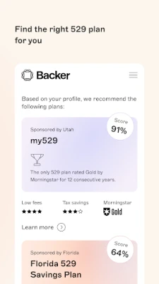Disclosures: This app is operated by Principly, Inc., an SEC-registered investment adviser using the trade name Backer. Investing involves risks, and any account you open or send money to may lose value. Investing in 529 plans in particular involves certain tax considerations and related risks. For disclosures, see backer.com/legal. "Backer" is a registered trademark of Principly, Inc. Copyright © 2025.