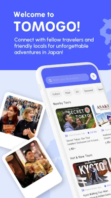 Embark on a personalized adventure through Japan with TOMOGO! Our tour leader-matching app redefines your travel experience, allowing you to choose friendly tour leaders, chat, and create unforgettable memories. Dive into various tour categories, connect with local guides, and explore cities like Tokyo, Osaka, Kyoto, and beyond. TOMOGO!—Your companion for unique, tailor-made journeys.