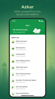 🤲 Azkar - This feature includes Dua and remembrance based on Hadiths and the Quran, which can be easily read and recited.